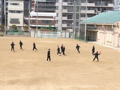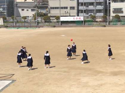 雨が上がり、今日は運動場で遊ぶ姿が見えました。赤いボールは2年生です。