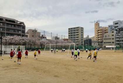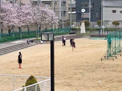 昨日は雨で使えなかった運動場では、野球部、サッカー部、陸上部が活動しています。雨の後でしたが、運動場の桜はまだきれいに咲いている中、それぞれ新入生が体験しています。