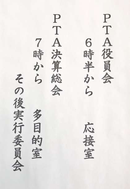 またその後、PTA実行委員会が行われ、新・旧の実行委員の方の引継ぎも予定されています。どうぞよろしくお願いいたします。