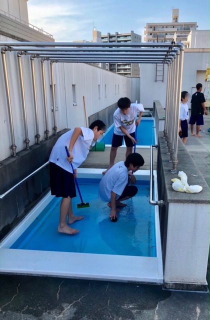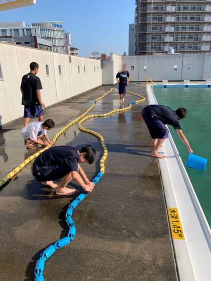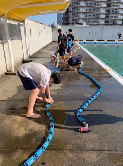 5月24日(金)放課後、男子バスケットボールのみなさんが、プールのコースロープをきれいに洗ってくれました。シャワーの部分もタワシやブラシで擦ってきれいにしてくれました。どうもありがとう!(来月からの水泳の授業に向けて、次はプールの内側の清掃となります。)