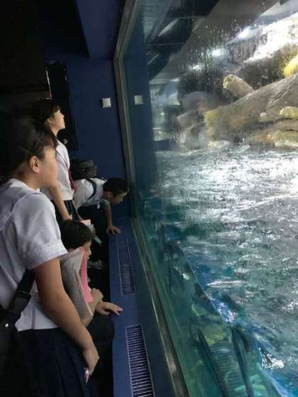 あいにくの雨ですが、海遊館に到着し、館内見学をしています。