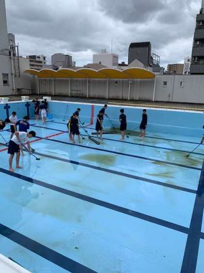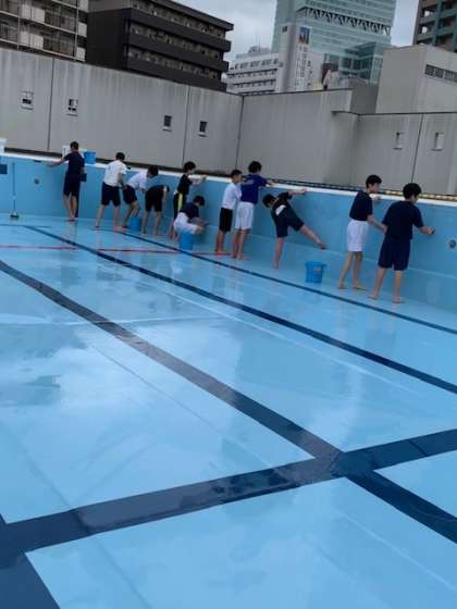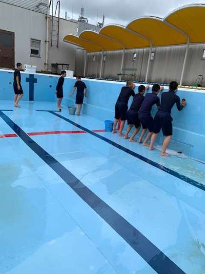 6月8日(土)水泳の授業に向けて、野球部と男子バレー部の生徒達がプールの中を綺麗に掃除してくれました。昨年の台風でプールの中に入ってしまった小枝などを取り除き、1年間の汚れをきれいにしてくれました。ありがとう!