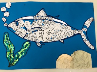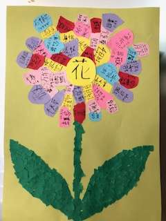 1枚目は魚へん、2枚目は雨かんむり、3枚目は花(植物)の名前の漢字を調べて、たくさん書き、貼り合わせて作りました。