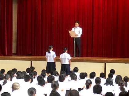7月8日(月) 本日の全校集会では、7月6日(土)に万博記念競技場で開催された「通信陸上大阪大会」の表彰が行われました。