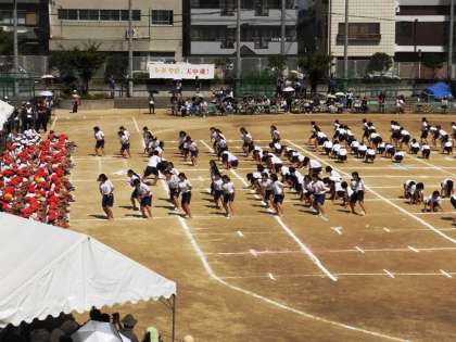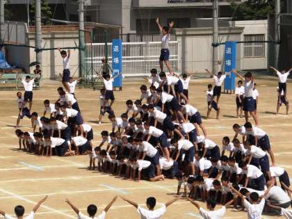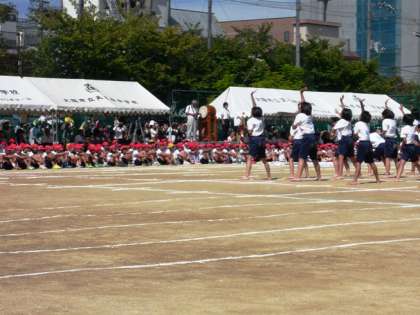 全学年女子による創作ダンス(ソーラン節)と全学年男子による組み体操の様子です。