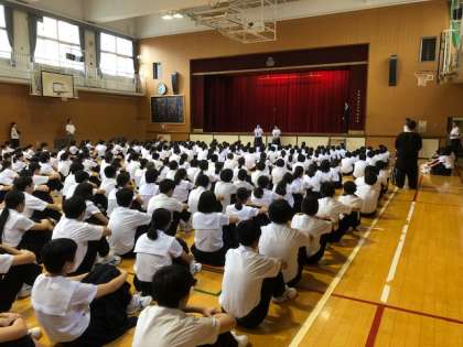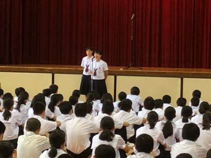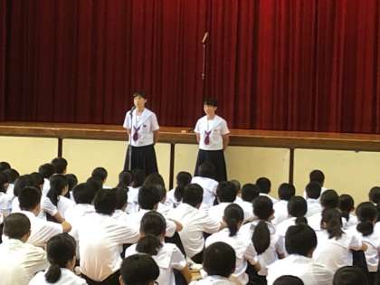 この夏、行われる全国大会に出場する陸上部の2年生・3年生の女子から、全校生徒に向けて決意表明をしてもらいました。