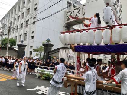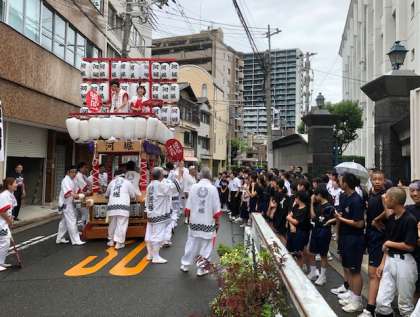 7月19日(金)午後、天王寺中学校に河堀稲生神社のだんじりが来てくださいました。部活動の生徒達と教職員でお迎えし、全員で「大阪締め」を行いました。わざわざ立ち寄ってくださり、ありがとうございました。