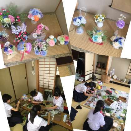茶道部では、夏休みの活動時にフラワーアレンジメント(造花)を行なっています。皆、工夫を凝らして制作しています。