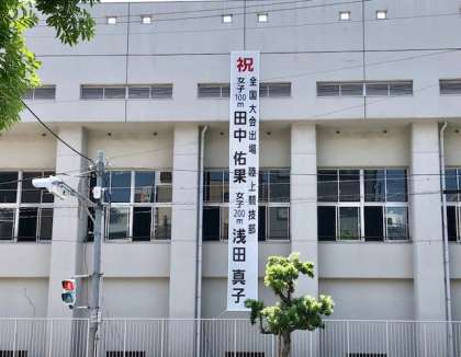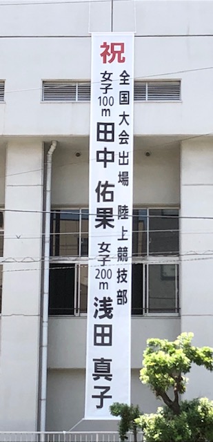 7月29日(月) 上町筋に面した体育館の東側の壁に、全国大会に出場する陸上部の田中さん、浅田さんを応援する垂れ幕が掲げられました。