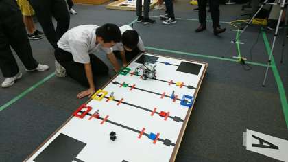 3日はミドル競技(初心者)に1・2年生の混合チームが出場しました。学校での練習では上手く出来ていた、しきい値、色選別が上手くいかず、成果を出しきれず、残念な結果に終わりました。この試合を通じて、場所や明るさが変わることにより、調整の難しさを更に実感しました。