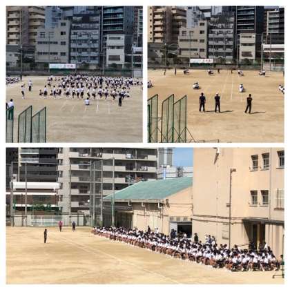 9月6日(金)午後、体育大会に向けて3学年揃っての全体練習が行われました。入場の練習や団体競技の入退場の練習を行いました。