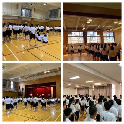 本日は非常に暑かったため、途中休憩の他に、各団(3学年縦割りのクラス団)の応援練習は体育館・格技室・多目的室で行いました。