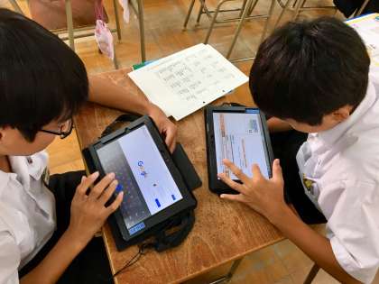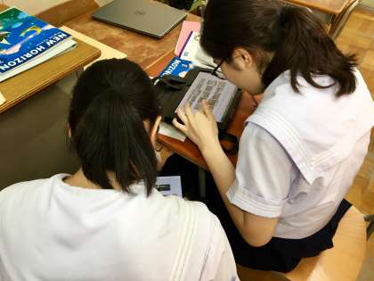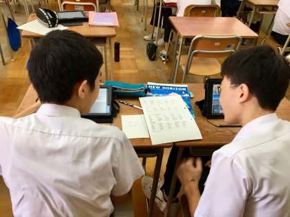 食べ物や祭り、建築物など紹介する文化についてタブレットで調べています。調べたことを英語でまとめていきます。