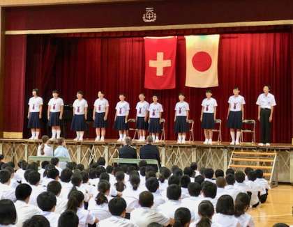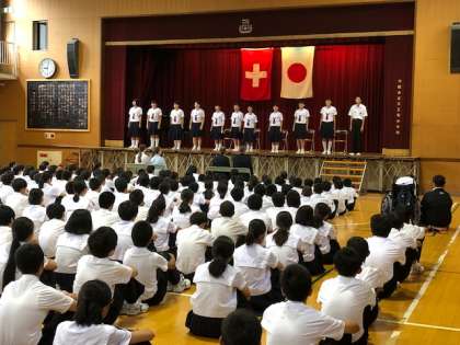 9月18日(水)1限、スイス姉妹校「オーバーヴィル中学校」の歓迎集会を行いました。