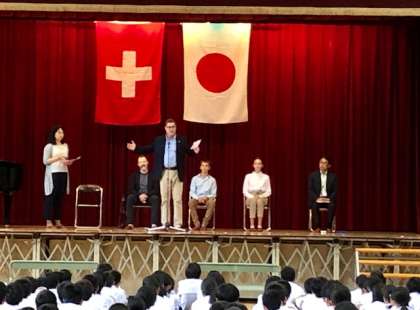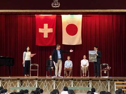 大西校長先生、トーメン校長先生からのあいさつ、また本校の国際交流委員の生徒から、英語と日本語で歓迎のあいさつも行われました。