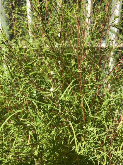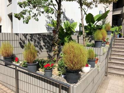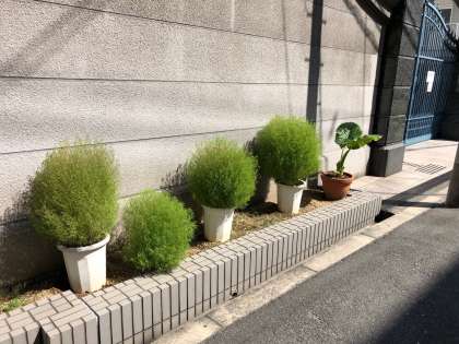 本校の正門付近や1年生教室の窓際のコキアが小さな花(下の写真の中央)をつけ始めました。