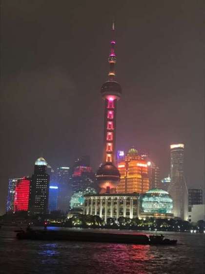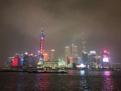 帰国前夜の上海、有名な外灘の夜景です。およそ100年前の上海で「東洋のウォール街」とよばれていた西洋建築群が建ち並ぶバンドこと外灘(ワイタン)エリア。上海市内を流れる黄浦江を挟み対岸に広がるのは、近未来的な高層ビルが林立する浦東(プートン)エリア。とてもきれいな夜景です。