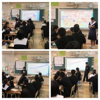 11月7日(木) 2年:数学科の研究授業も行われました。「一次関数」の応用の学習でした。携帯電話の料金プランを表やグラフを使って調べることを通して、関数の特徴を考え、また各班おすすめのプランをタブレットでグラフを作成し、発表していました。