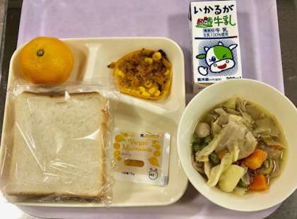 でした。給食のスープやお味噌汁はいつも具だくさんで、今日は豚肉・キャベツの他に、タマネギ、ジャガイモ、ニンジン、グリーンピース、ウインナーソーセージが入っていました。