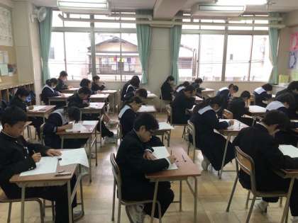 11月27日(水) 2学期期末テストの一日目、国語・英語・美術・音楽のテストが行われました。みんな真剣に問題に取り組んでいました。頑張れ、天中生!