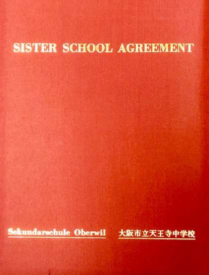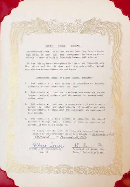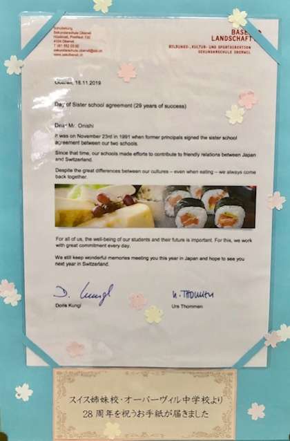 この写真は、今週の全校集会の中で校長先生より紹介のあったスイス姉妹校・オーバーヴィル中学校より届いた姉妹校28周年を祝うお手紙と、1991年11月23日に当時の枝元校長先生と相手校の校長先生が結んだ姉妹校の協定書です。