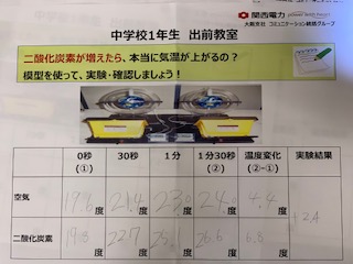 地球温暖化についてのモデル実験をした結果です。二酸化炭素の温室効果を知ることができました。