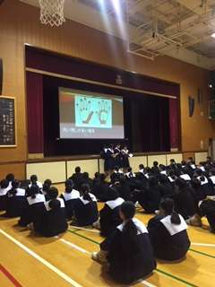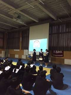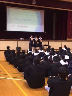 今週の学年集会で、各学年の保健委員からインフルエンザの予防について呼びかけました。インフルエンザの症状や、正しいマスクのつけ方、手洗い・うがいについて、スライドを見せながら説明をしました。