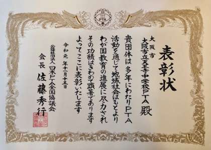 12月6日(金)夜、12月のPTA実行委員会が行われました。この中で、先日、天王寺中学校PTAがPTA全国協議会から表彰されたことを、矢倉会長から報告と表彰状の披露がありました。いつもありがとうございます。今後とも、どうぞよろしくお願いします。