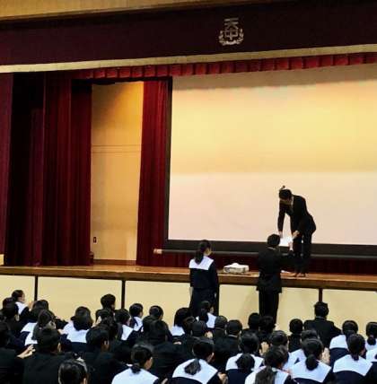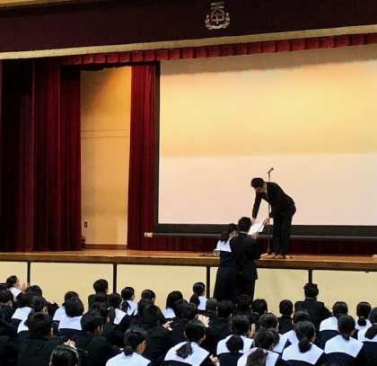 本日の全校集会の中で「第65回大阪市青少年読書感想文コンクール」で「学校図書館協議会賞」を受賞した3年生の男子と1年生の女子が表彰されました。よく頑張りました。