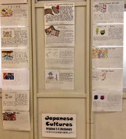3年生は英語の授業で作成したオリジナルの「英英辞典〜Japanese Culture 日本文化を英語で説明しよう〜」が展示されています。3年生にもなると、長い文章も書けるようになってきますね。絵も入ってきれいに仕上がっています。