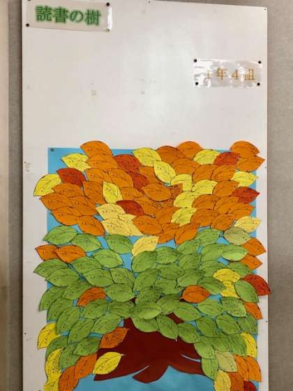 1年生は「読書の樹」の葉が紅葉もして、生い茂っています。たくさん本を読んでいる証拠ですね。