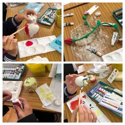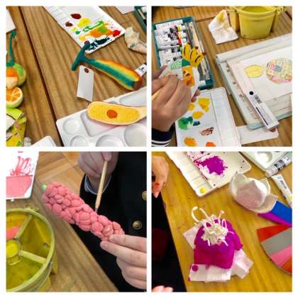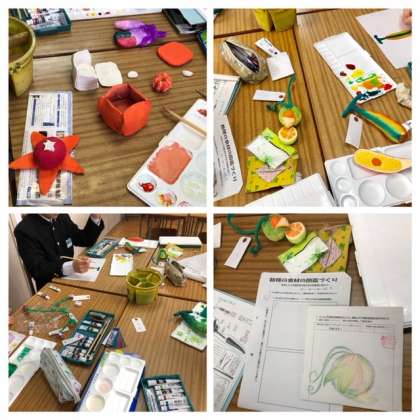 おいしそうで魅力的な色と形に工夫して「新種の食材」について創作画を描き、その絵を元に紙粘土で制作していました。生徒の独創的な発想がとても興味深いです。完成した作品をまた見せてくださいね。