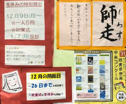 学校図書館は12月26日(木)まで開館しています。部活動や元気アップの学習会の前後にでも、ぜひ本を借りに来てください。