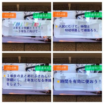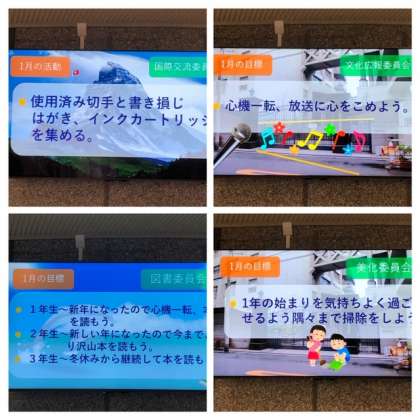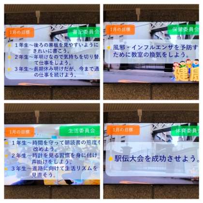 1階ピロティの天中ビジョンに、各専門委員会の1月の目標が映し出されています。それぞれ目標を意識して行動しましょう。