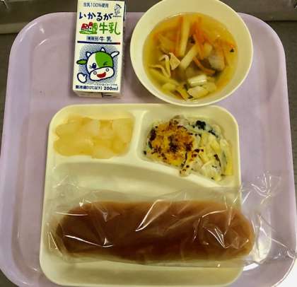 でした。マカロニグラタンには鶏肉・ほうれん草、玉ねぎが、スープには大根の他に豚肉、じゃがいも、ニンジン、枝豆、パセリが入っていました。