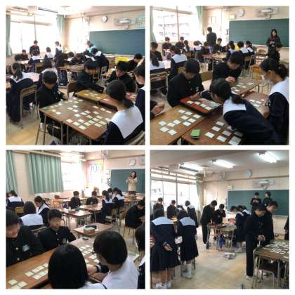 来週は1,2年生共に、「百人一首大会」が行われます。1年生も各クラスで練習を行っています。どのクラスもとても楽しそうでした。