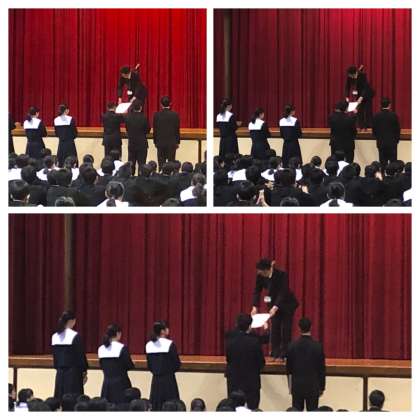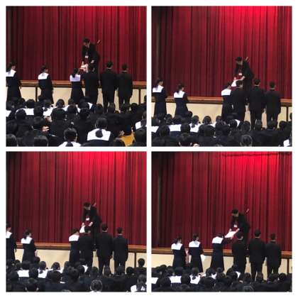 1月27日(月) 全校集会の中で、1月25(土)26(日)に行われた男女バスケットボール部の8ブロックの大会の表彰が行われました。男女ともに優勝です。優秀選手も選ばれています。本当によく頑張りましたね!