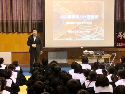 2月5日(水) 午後、1年生は総合的な学習「国際理解教育・キャリア教育」として、JICAの実施している青年海外協力隊に参加された方からお話をうかがっています。