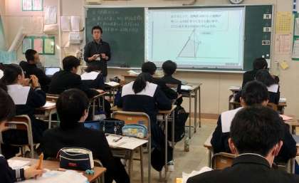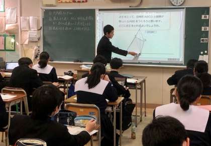 2月6日(木) 2年生の数学の授業の様子です。参観させていただいた時には、『平行線と面積』という単元の「平行線を利用して四角形と同じ面積の三角形を作るには、どうすればよいか」という問いを考えていました。