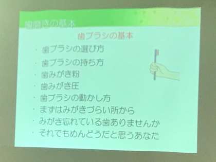 次に「歯の磨き方」について、お話していただきました。自分の歯の健康チェックから始まり、歯ブラシの持ち方、ブラッシングの仕方などについて、丁寧に指導していただきました。ありがとうございました。今日教えていただいたように正しく歯を磨きましょう。
