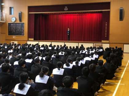 2月17日(月) 校長先生より各学年が3月に向けて頑張ってほしいというお話がありました。3年生は卒業式までの19日間、仲間としての絆を感じながらしっかりと頑張ってほしい。2年生は先週行われた「朗読劇」が非常に素晴らしかった。表現豊かに迫力のある朗読に、日頃の授業にしっかりと向き合っていることも感じたし、鑑賞している態度も素晴らしかった。2年生は最高学年に向けて、1年生は後輩が入学してくる2年生に向けて、また、3年生の素晴らしい送り出しができるように、頑張りましょう。