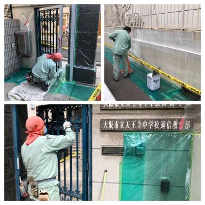卒業式を前に、今週、正門と正門横の塀の塗装をしていただいています。