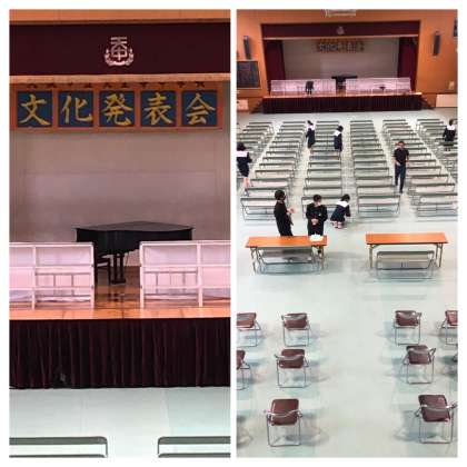 今年度は音楽コンクールも行う予定で、これまで感染症対策を講じながら、各クラスが工夫を凝らして練習を行ってきました。本日、体育館の発表会場も仕上がり、校舎内の展示見学の準備も整いました。明日は音コンをはじめ、教科の展示や文化部の発表や展示等、この状況の中でできる限りの文化発表会を行います。
