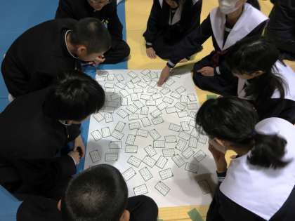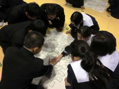 1年生の百人一首大会が12日(木)に実施されました。各クラスから男女別の出席番号順に2名ずつ出て8人が一つの班になり、100枚のカルタを囲みました。国語の授業でのカルタ練習は、百人一首は初めてという人も多く「けふ→(きょう)」「あふさか→(おうさか)」など歴史的仮名遣いを復習しながらの対戦でしたが、30種以上覚えようという冬休みの課題(最高暗記数は95枚!)もあり、上の句を聞いただけで札を取る人もたくさんいました。本番では、先生方が10首ごとに交替で和歌を読み、「秋の田の」から始まる天智天皇の句や「春過ぎて」の持統天皇の句は最初の5文字で競い合い、札を読むごとに取ったり取られたりの嬉しい声や悔しい声で大いに盛り上がりました。クラスの勝敗は、学級全体で取った枚数を合計して参加人数で割った平均数で決まります。優勝は1組(14.4枚)準優勝は2組(12.8枚)でした。