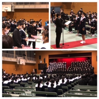 昨日の予行の様子です。残念ながら、在校生が本日の卒業式に参列できないので、せめてでも先輩の最後の姿をみてもらうため、3年生の全体合唱を聞いてもらいました。あと、在校生から卒業生へのコサージュの贈呈式や校長先生から代表生徒へ賞状の贈呈が行われ、今日の卒業式を迎えます。