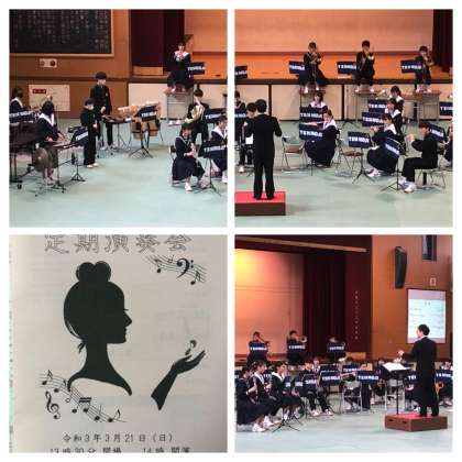 3月21日の午後2時より、吹奏楽部の定期演奏会が行われました。感染症対策のために、鑑賞していただく方を保護者等に限定しての実施となりましたが、悪天候にもかかわらず、たくさんの保護者の方に来場していただけました。
