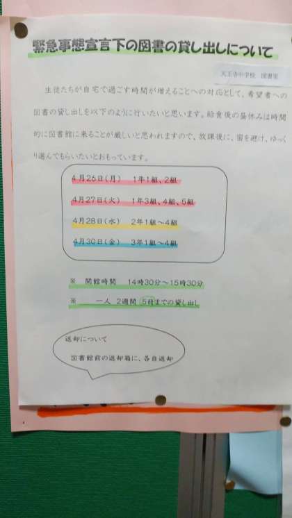 緊急事態宣言期間中の図書の貸し出しを、日時を決めて行います。