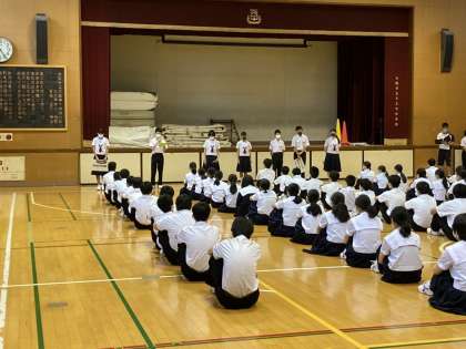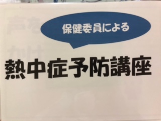 今週の学年集会では、各学年の保健委員がこれからの気温の上昇に備えて、熱中症予防講座を開催しました。パネルを用いて、みんなに気を付けてほしいことを呼びかけました。