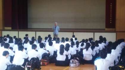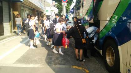 「我々3年生は、信州・高山・上高地へ行き、豊かな自然の中での体験活動や班活動などを通し、協調性と責任感を育て、修学旅行を成功させるよう精いっぱい頑張ってきます。」の生徒会長の挨拶から始まった出発式。いよいよ修学旅行出発です。