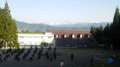 2日目の朝です。とても空気は爽やかで、天気も良好です。白山の絶景に生徒たちは感動です。